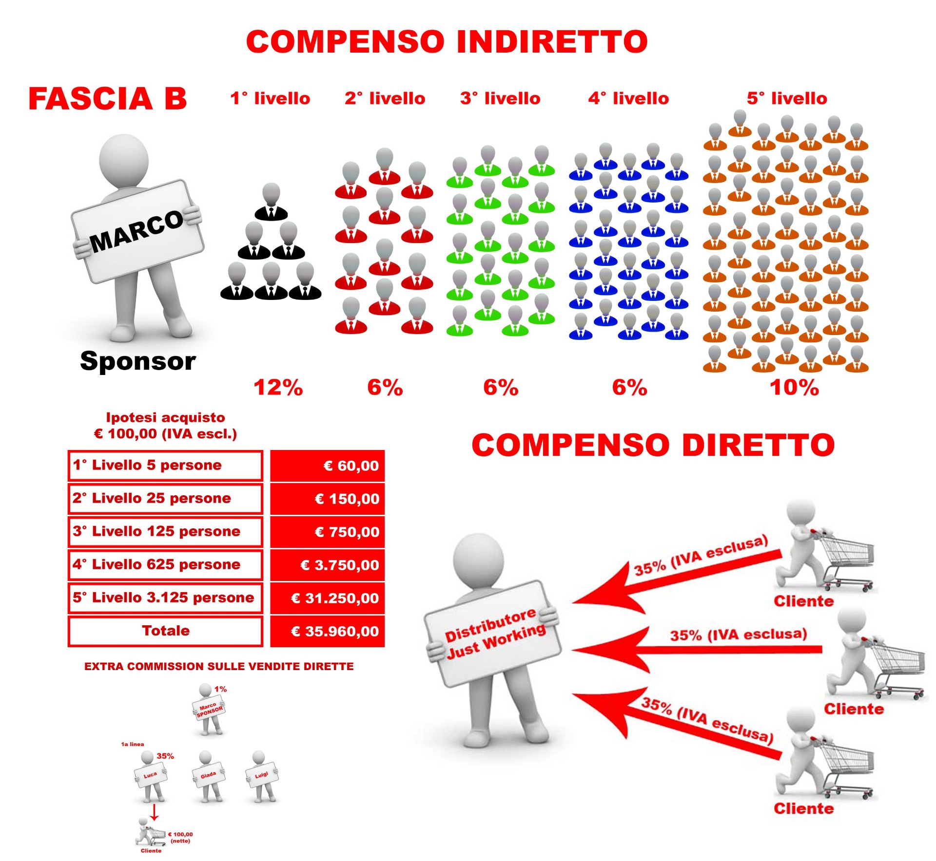 Guadagnerai il 40% per ogni persona che iscrivi personalmente + dal 35% al 50% se qualche persona acquista dal tuo e-commerce in piu' si aprirà una matrice forzata 5X5 che genererà un passivo che parte dal 12% sulla prima linea fino al 6% alle linee indirette.